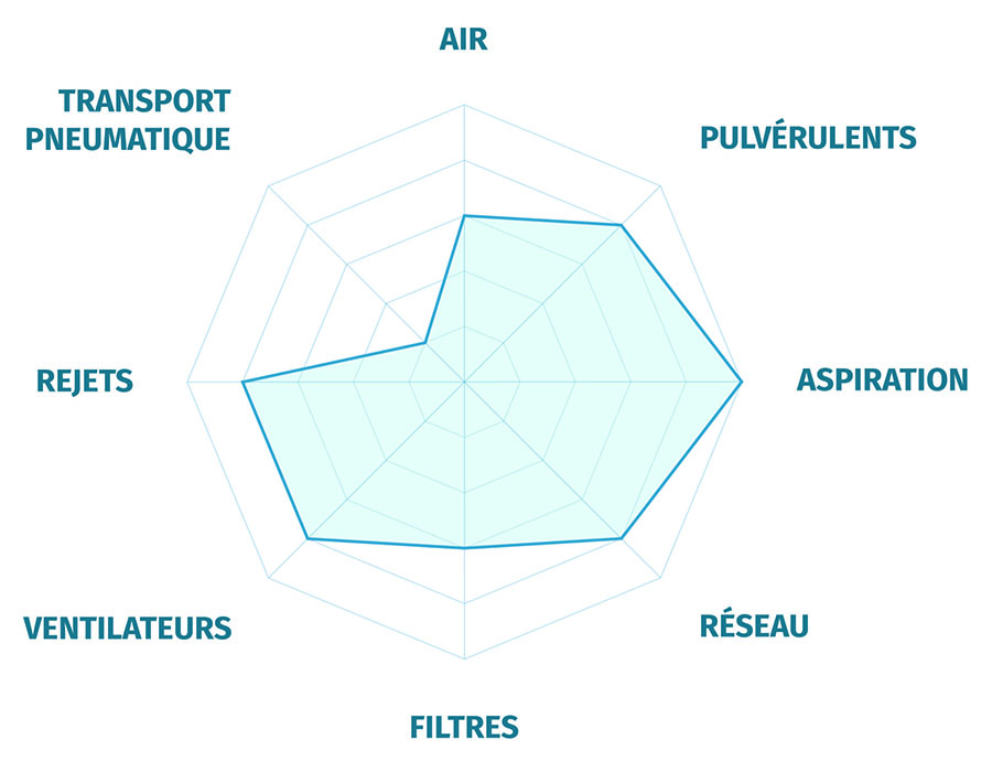 Le process aéraulique poudre, le transport pneumatique, le dépoussiérage et la maîtrise des rejets liés à l’air.